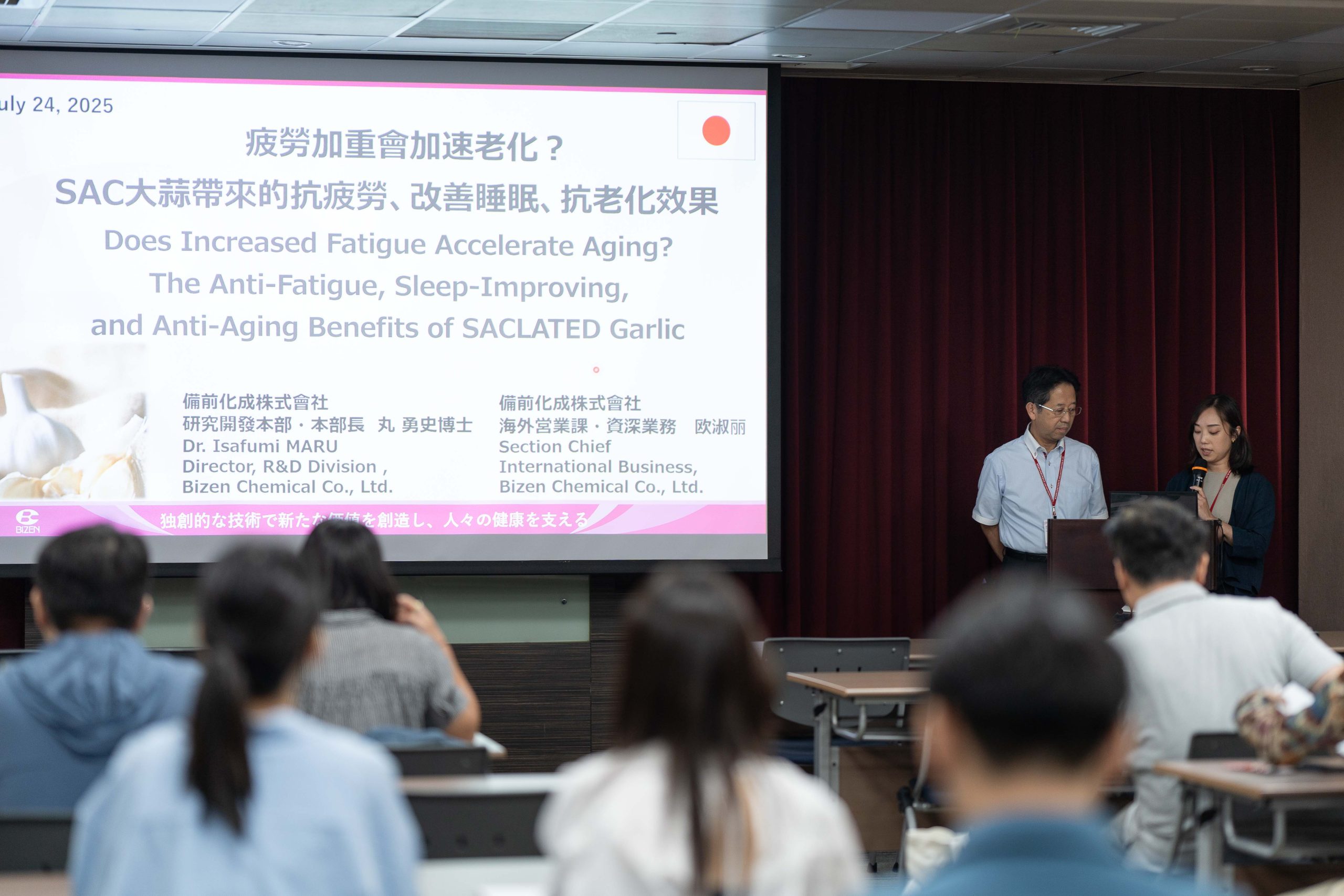 - 由日本備前株式會社 研究開發本部 本部長 丸 勇史博士及海外營業部 資深業務代表 Ms. AW SOOK LIH 分享SAC大蒜的抗疲勞、改善睡眠、抗老化與產品企劃及市場創新應用。